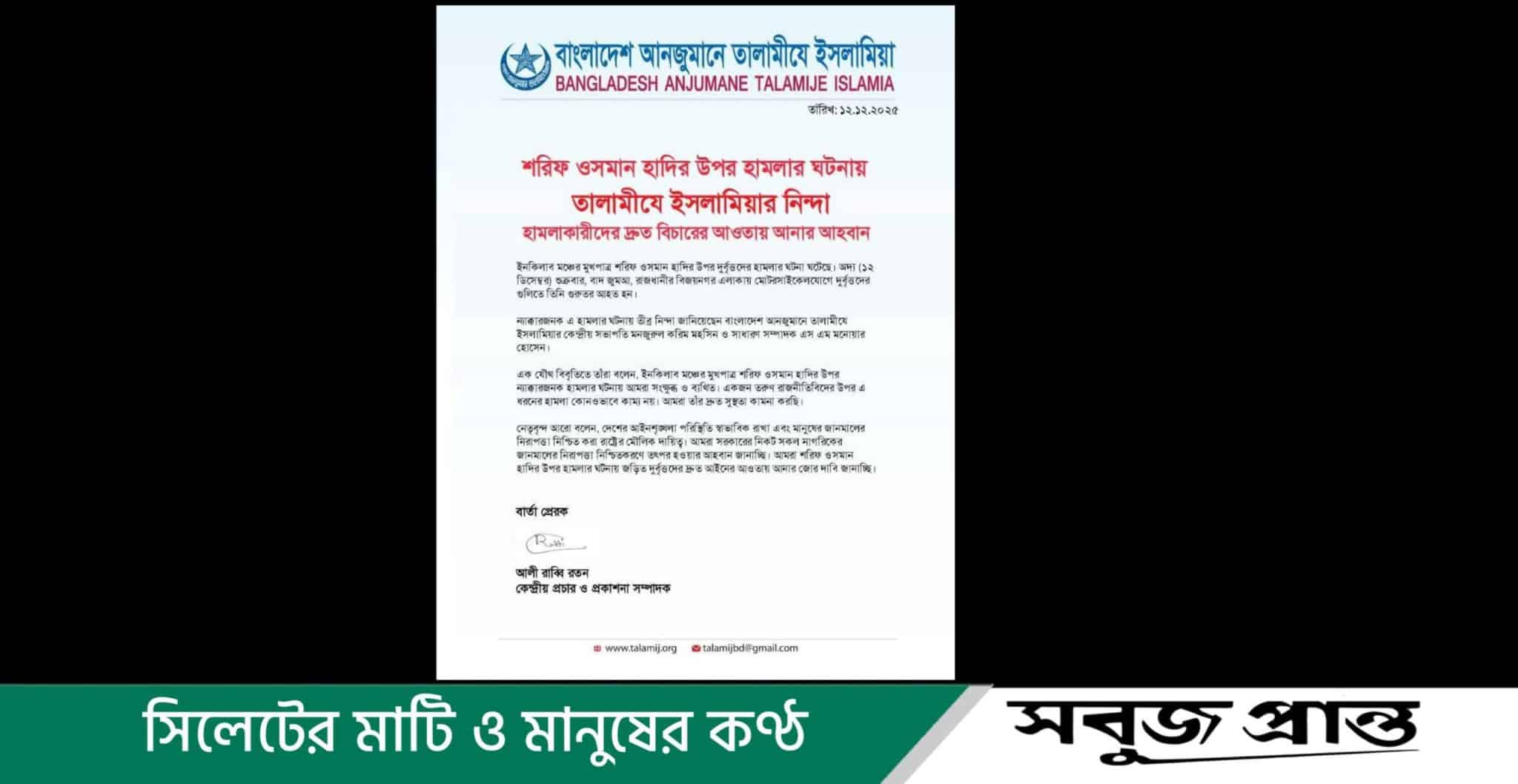 রাজধানীর বিজয়নগরে ইনকিলাব মঞ্চের মুখপাত্র শরিফ ওসমান হাদির উপর সন্ত্রাসী হামলার ঘটনায় গভীর উদ্বেগ ও তীব্র নিন্দা জানিয়েছে বাংলাদেশ আনজুমানে তালামীযে ইসলামিয়া।