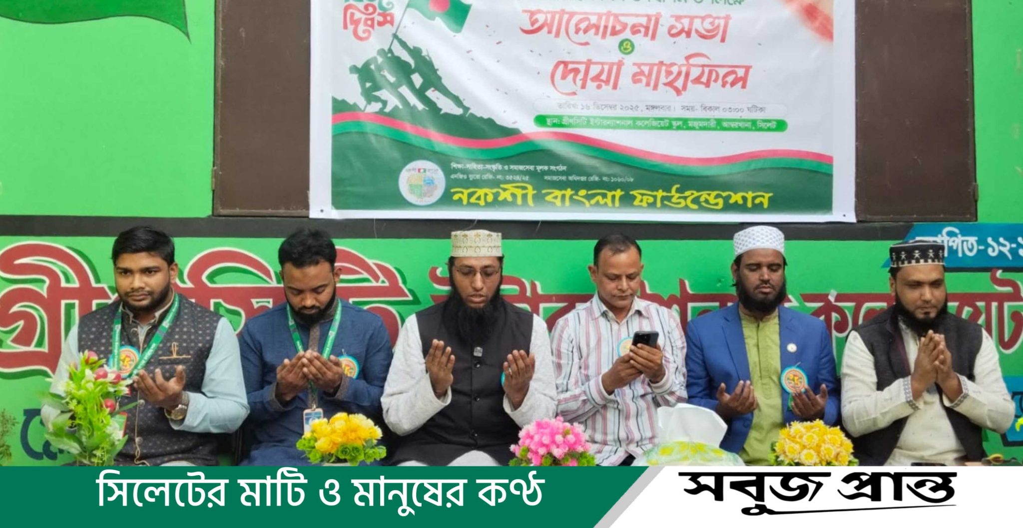 মহান বিজয় দিবস উদযাপন উপলক্ষে স্বেচ্ছাসেবী সংগঠন নকশী বাংলা ফাউন্ডেশন-এর উদ্যোগে আলোচনা সভা ও শহীদদের স্মরণে দোয়া মাহফিল অনুষ্ঠিত হয়েছে। গতকাল মঙ্গলবার (১৬ ডিসেম্বর) বিকেল ৩টায় সিলেট নগরীর আম্বরখানাস্থ গ্রীণসিটি কলেজিয়েট ইন্টারন্যাশনাল স্কুলের হলরুমে এ অনুষ্ঠান আয়োজন করা হয়।